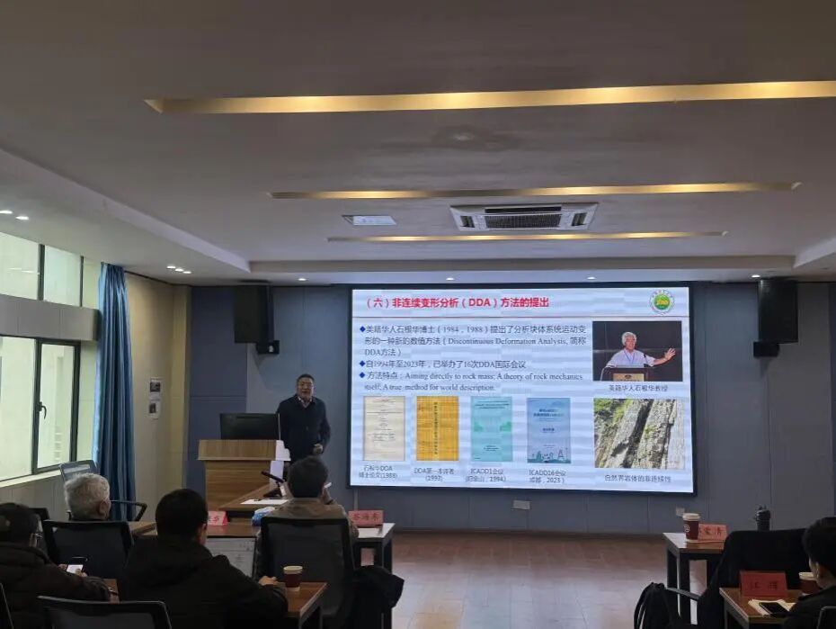 长江科学院邬爱清正高级工程师应邀做了题为“裂隙岩体非连续变形分析方法及工程应用”的主题报告。他介绍了DDA自上世纪90年代以来的理论成果、工程应用与研究体会,阐述了DDA相对连续介质方法的本质特点与收敛原则,并通过一系列工程验证了其应用效果。